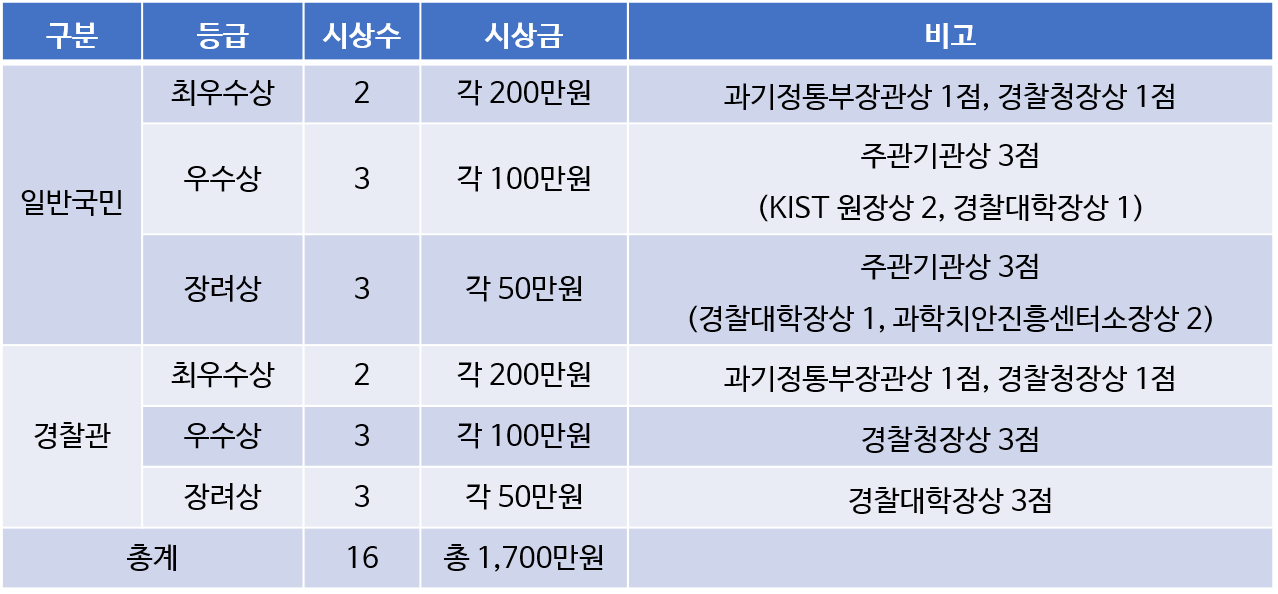 - 과학기술을 통해 치안현장을 강화하거나 국민안전·편익을 제고할 수 있는 아이디어 공모