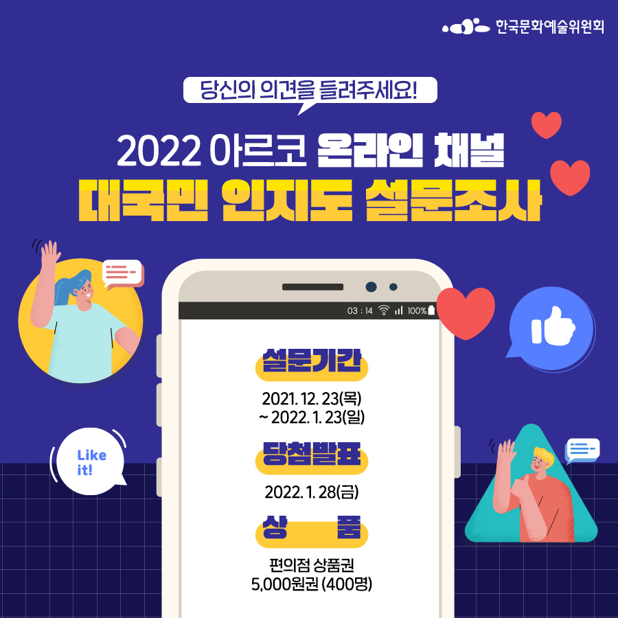 한국문화예술위원회 온라인채널 대국민 인지도 설문조사에 참여해주세요! 2021. 12. 23(목) ~ 2022. 1. 23(...