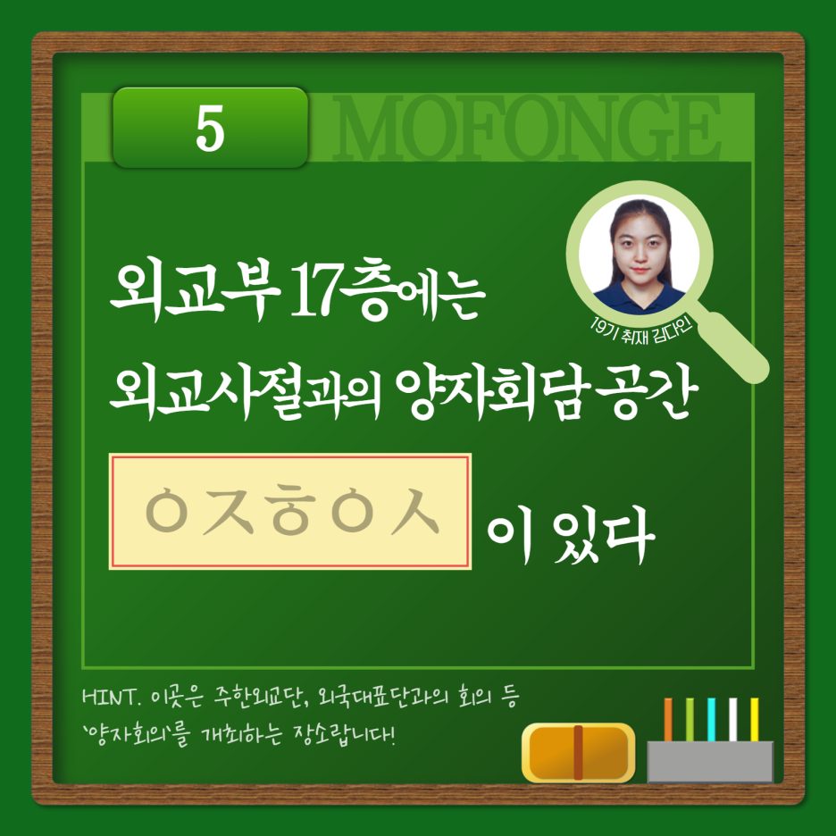 5. 외교부 17층에는 외교사절과의 양자회담 공간 [ㅇㅈㅎㅇㅅ]이 있다