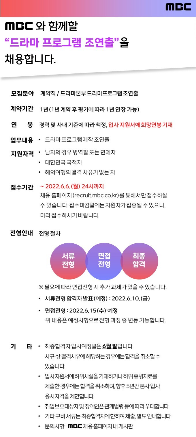 | MBC 시사교양운영팀 제작행정 담당 모집(~0601) - 마감 (0) | 2022.05.26 |