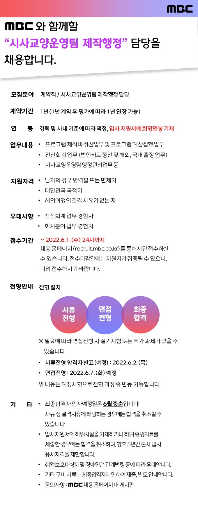 | MBC 드라마 프로그램 조연출 모집(~0606) - 마감 (0) | 2022.05.26 |